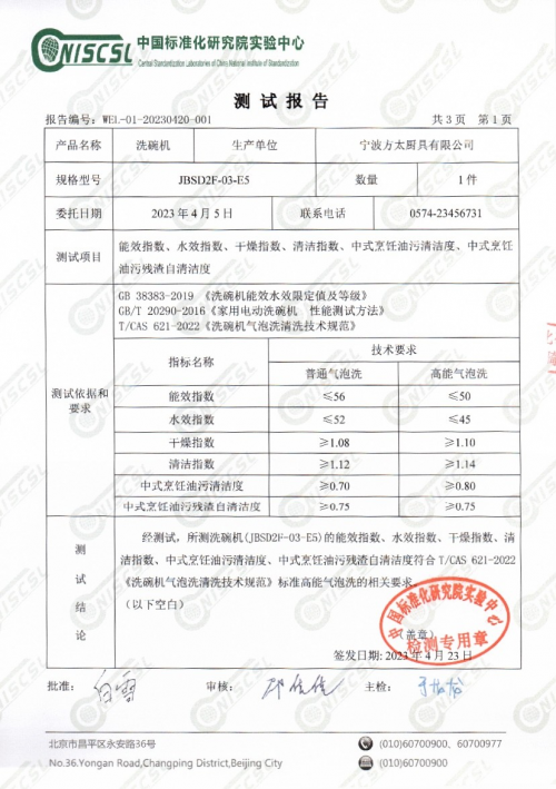 2022年,方太聯(lián)合中國(guó)家用電器研究院發(fā)布首個(gè)《洗碗機(jī)氣泡洗清洗技術(shù)規(guī)范》,此次舉辦的媒體溝通會(huì)上,方太水槽洗碗機(jī)新5系又通過(guò)了中國(guó)標(biāo)準(zhǔn)化研究院完成技術(shù)驗(yàn)證,經(jīng)由嚴(yán)苛的技術(shù)測(cè)試和實(shí)效檢驗(yàn),測(cè)試結(jié)果最終為,能效指數(shù)50、水效指數(shù)45、干燥指數(shù)1.29、清潔指數(shù)1.24、中式烹飪油污清潔度0.87、中式烹飪油污殘?jiān)郧鍧嵍?.77,各項(xiàng)指標(biāo)均符合要求,其中干燥指數(shù)、清潔指數(shù)均高于國(guó)家一級(jí)水效標(biāo)準(zhǔn)基數(shù),且對(duì)中式烹飪油污的清潔效果顯著。