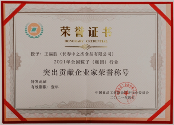 有鑒于中之杰長久以來對弘揚粽子文化事業(yè)的貢獻,在2021年,中之杰董事長王福勝先生獲得機構(gòu)頒發(fā)的“突出貢獻企業(yè)家”稱號,體現(xiàn)出中之杰在行業(yè)內(nèi)的領(lǐng)軍實力和頂流水平。王福勝還帶領(lǐng)中之杰分別榮獲 “長春民營經(jīng)濟突出貢獻企業(yè)”和“民營經(jīng)濟突出貢獻企業(yè)家”等榮譽。同時,王福勝還擔任中國食品工業(yè)協(xié)會粽子行業(yè)委員會會長職務(wù),為行業(yè)發(fā)展盡職盡責。