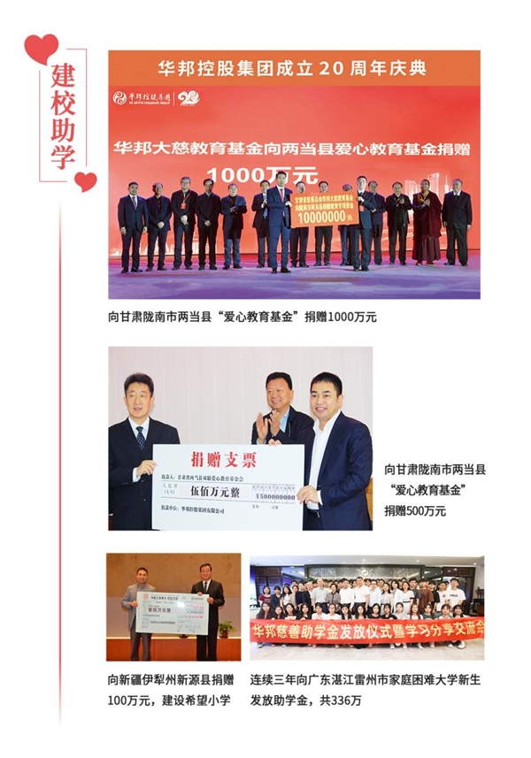 利合一,回報(bào)社會(huì)。23年來,華邦控股集團(tuán)不斷發(fā)展壯大,實(shí)現(xiàn)高質(zhì)量發(fā)展,得益于時(shí)代,得益于黨和政府及社會(huì)各界的關(guān)心與支持。助力鄉(xiāng)村振興,僅是華邦履行社會(huì)責(zé)任的縮影。華邦作為廣東省百強(qiáng)民營企業(yè),始終心懷感恩,勇于擔(dān)當(dāng),用心用情投身于各項(xiàng)慈善公益事業(yè),回饋社會(huì)。迄今為止,華邦在鄉(xiāng)村振興、建校助學(xué)、賑災(zāi)援助等公益領(lǐng)域累計(jì)捐款捐物數(shù)億元。