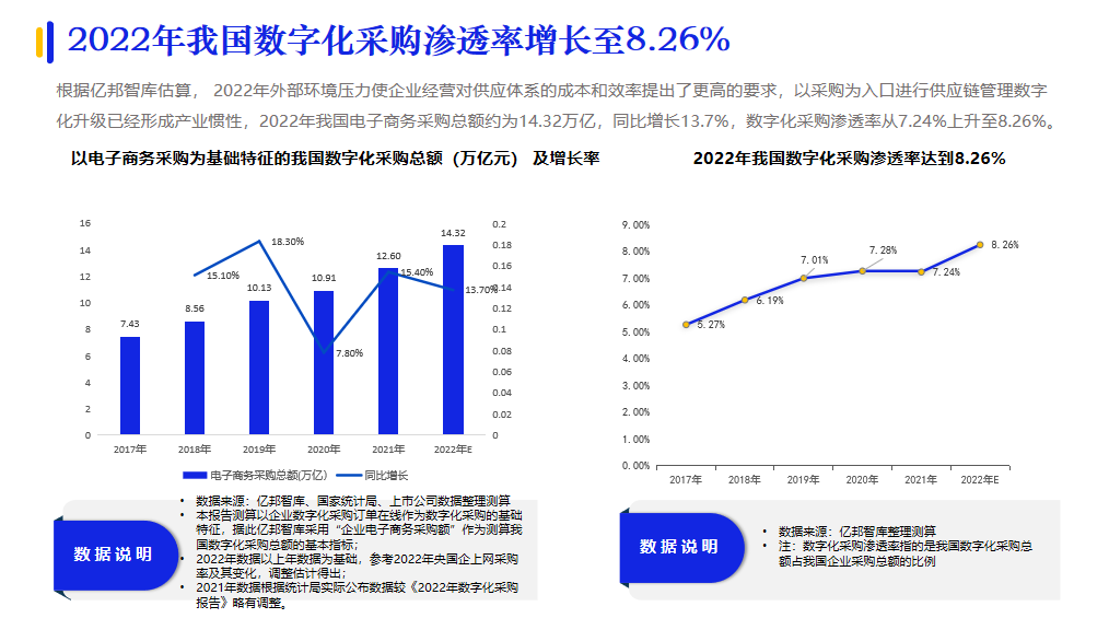 《報告》測算,2022年我國企業(yè)采購規(guī)模超過173萬億元,電子商務采購總額為14.32萬億元,數字化采購率升至8.26%,我國數字化采購市場發(fā)展動力充足。