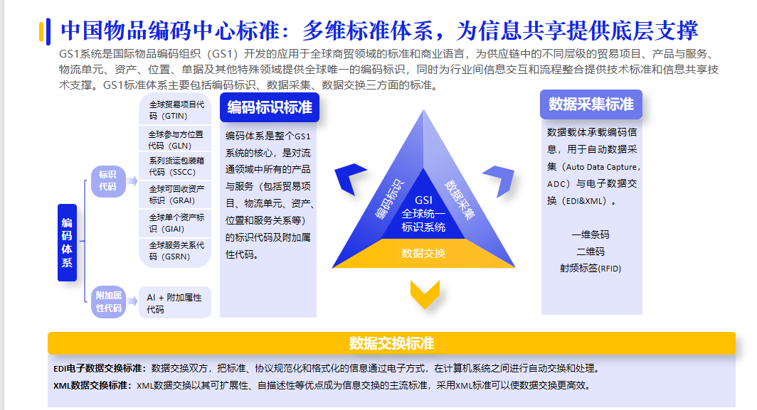 統一物品編碼標準一直是采購供應鏈領域的重點和難點。中國物品編碼中心的GS1系統是國際物品編碼組織(GS1)開發(fā)的應用于全球商貿領域的標準和商業(yè)語言,為供應鏈中的不同層級的貿易項目、產品與服務、物流單元、資產、位置、單據及其他特殊領域提供全球唯一的編碼標識,同時為行業(yè)間信息交互和流程整合提供技術標準和信息共享技術支撐。
