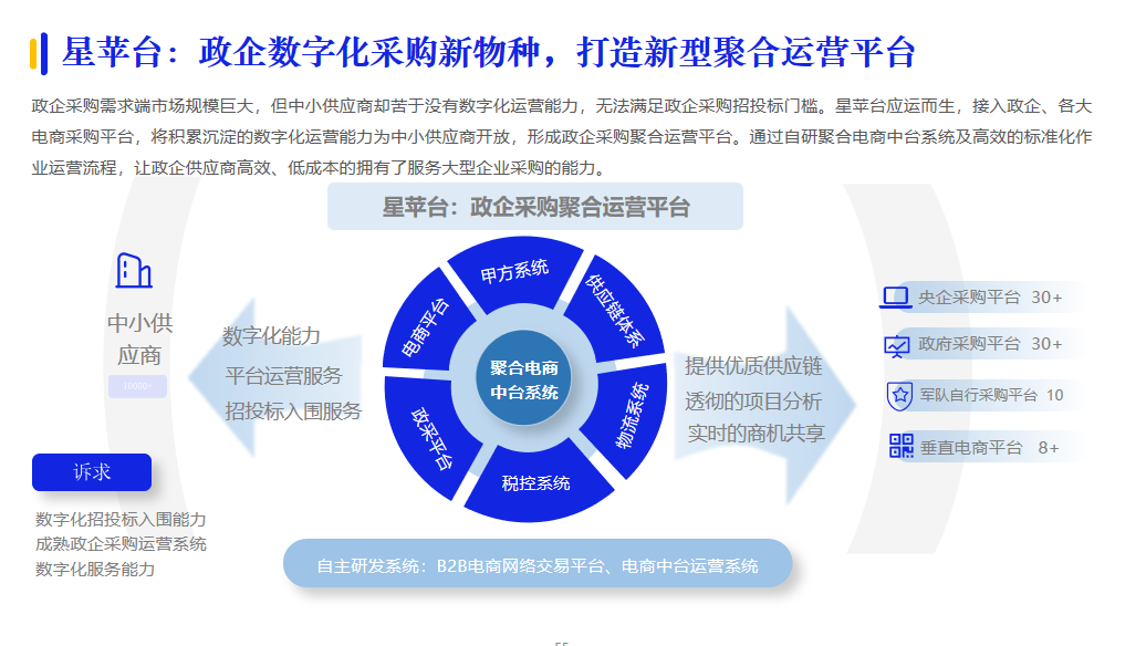 業(yè)務+數據的雙中臺模式,也是今年技術服務商在中臺方面的創(chuàng)新看點。從業(yè)務系統獲取的信息經過數據中臺的處理,再經過業(yè)務中臺的分析后,為企業(yè)提供智能決策支持。例如,星蘋臺通過自研聚合電商中臺系統,接入政企、各大電商采購平臺,將積累沉淀的數字化運營能力為中小供應商開放,讓其擁有了服務大型企業(yè)采購的能力。