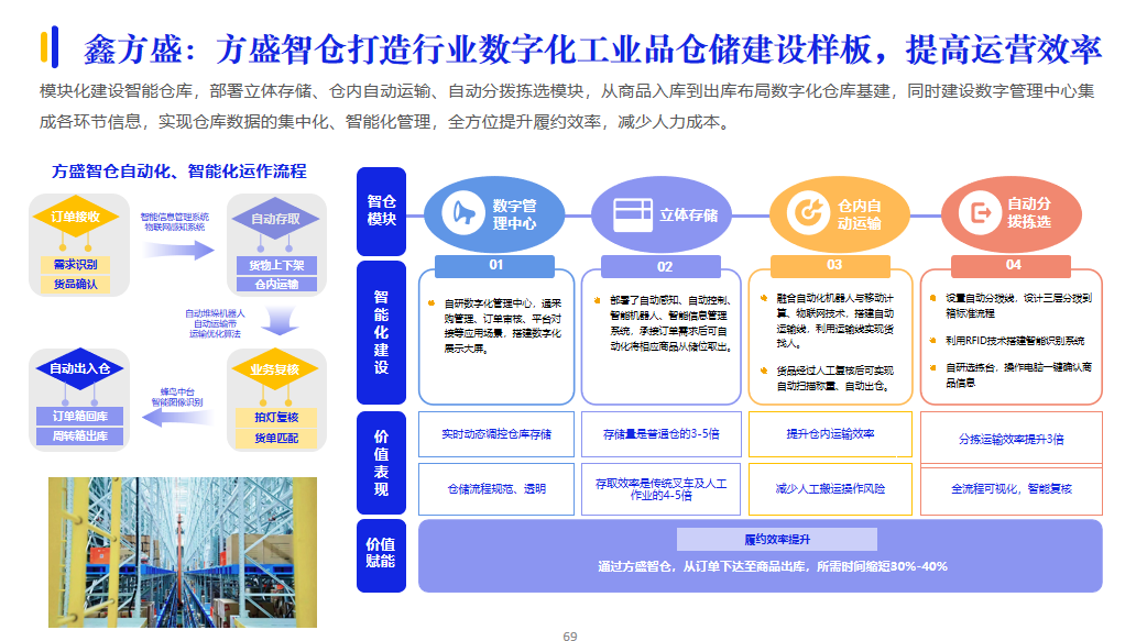 履約能力是供應商的核心競爭力。在履約服務方面,為了提高履約交付效率,供應商加大AI等技術投入應用,建設智能倉儲、智慧物流等數智供應鏈體系。例如,鑫方盛的方盛智倉打造行業(yè)數字化工業(yè)品倉儲建設樣板,實現倉庫數據的集中化、智能化管理,全方位提升履約效率,減少人力成本。