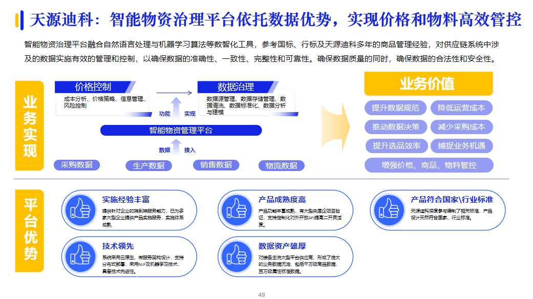 部分央國企會根據企業(yè)自身的數字化薄弱點,采取有針對性地補齊斷點的實施策略,包括供建立應商協同管理系統、優(yōu)化物資分類與編碼設計、建立供應商管理體系、建設電商采購平臺、設計倉儲管理體系等內容。例如:天源迪科在智能物資治理方面,提出了價格和物料高效管控的解決方案,有效確保價格數據的合法性和安全性。