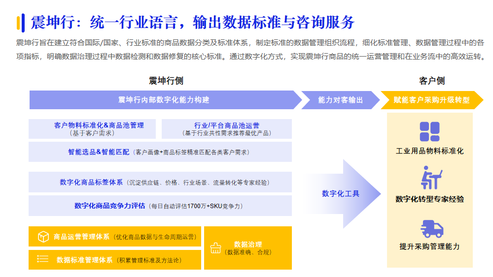 為企業(yè)提供場景、行業(yè)適配的產品與服務是供應商的基礎能力。可以借助AI等數字化技術服務,基于場景梳理的標準化實現商品智能匹配,已經成為供應商服務升級的方向。例如:震坤行通過建立國際/國家、行業(yè)標準的商品數據分類及標準體系,明確數據治理過程中數據檢測和數據修復的核心標準,再基于場景梳理,建立數字化商品標簽體系,實現震坤行商品的統一運營管理和在業(yè)務流中的高效運轉。