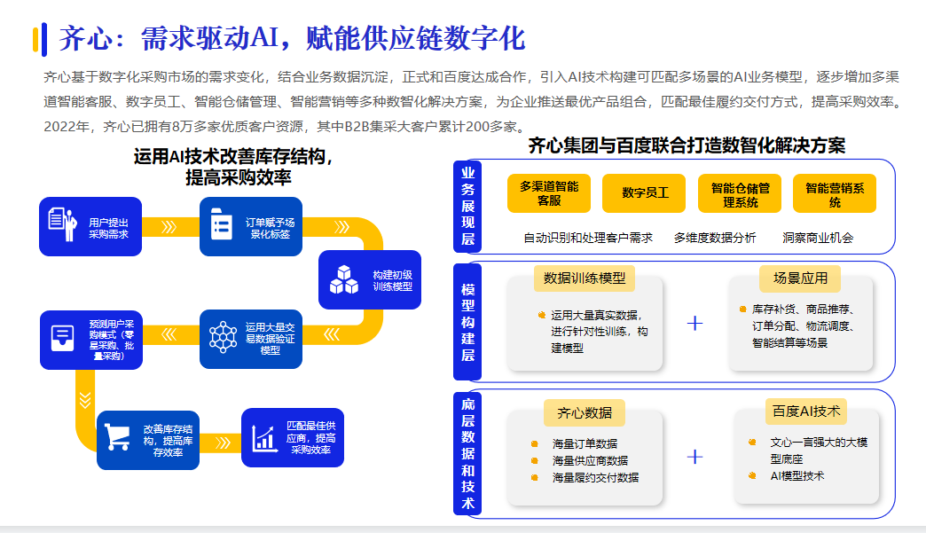 今年還有不少供應商在數字供應鏈建設方面,推出升級的智能化服務。比如,齊心引入AI技術構建可匹配多場景的AI業(yè)務模型,為企業(yè)匹配最佳履約交付方式。
