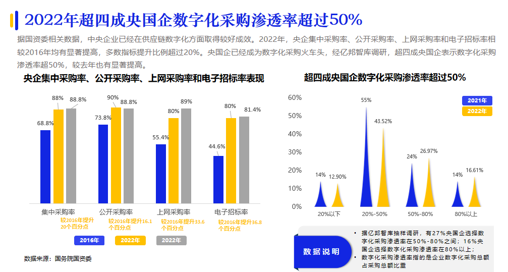 央國企在我國企業(yè)采購數字化進程中的火車頭效應越發(fā)明顯。據億邦智庫調研,超四成央國企表示數字化采購滲透率已經超過50%;形成了央國企先行,引發(fā)供應鏈各環(huán)節(jié)企業(yè)參與數字化創(chuàng)新變革的發(fā)展態(tài)勢。