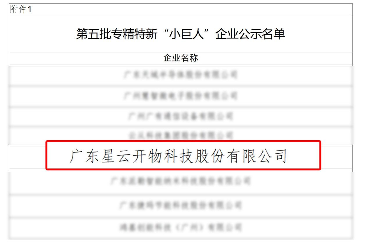 ? ? 7月14日,國(guó)家工信部發(fā)布了《關(guān)于廣東省第五批專精特新“小巨人”企業(yè)和第二批專精特新“小巨人”復(fù)核通過企業(yè)名單的公示》,廣東「星云開物」科技股份有限公司以優(yōu)異的綜合實(shí)力成功入選,榮列2023年國(guó)家級(jí)第五批專精特新“小巨人”企業(yè)公示名單。