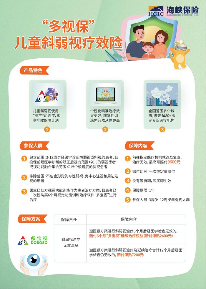 弱視和斜視作為兒童眼科的常見疾病,是導(dǎo)致兒童視覺障礙的主要原因,不僅影響兒童的正常視覺功能,對生活學(xué)習(xí)造成困擾,甚至影響未來的工作能力,孩子一旦診斷為斜弱視應(yīng)及早診治。然而,受到斜弱視本身治療周期長、收效慢、易復(fù)發(fā)、治療花費(fèi)多等特點(diǎn)的影響,對于孩子斜弱視的治療,許多家長顧慮重重,治療信心也不足,可能更有甚者會因?yàn)殄e誤的認(rèn)知或者為了單純省錢而選擇了不適宜孩子實(shí)際病情的治療方法,最后耽誤了孩子病情,悔之晚矣。那么是否有一款專門針對兒童斜弱視的產(chǎn)品,既可以有效治療疾病受到專家權(quán)威認(rèn)可,又可以讓孩子開心愉悅治療提高依從性,還可以對治療效果進(jìn)行保駕護(hù)航呢?相信這是絕大多數(shù)斜弱視患兒家長心中一直期待的完美方案,現(xiàn)在“多視?!钡臋M空出世終于讓家長們的期待夢想成真。視景醫(yī)療一直堅(jiān)持“以患者為中心,以療效為導(dǎo)向”的初心,攜專業(yè)團(tuán)隊(duì)與海峽保險(xiǎn)共同推出全球商保領(lǐng)域首個兒童斜弱視療效險(xiǎn)產(chǎn)品“多視?!?#xff0c;為我國兒童斜弱視患者及家庭帶來更好的治療保障選擇。