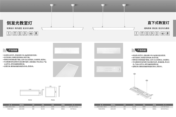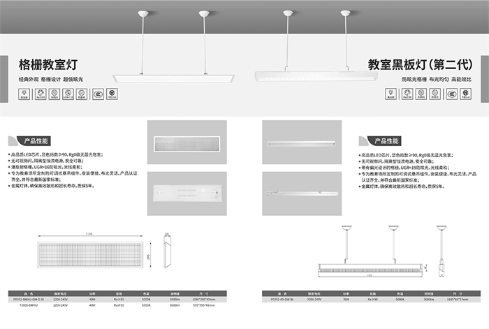 其中,LED UGR教室燈設(shè)計輕薄,造型簡約,能夠讓教室煥然一新;LED直下式教室燈采用微棱鏡擴散板,發(fā)光均勻柔和;LED格柵教室燈采用格柵面板設(shè)計,光線均勻柔和;LED黑板燈采用漫反射型光柵,高光效,低能耗。