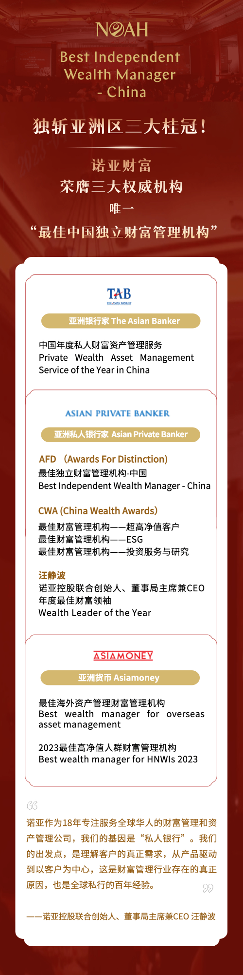 《亞洲貨幣》、《亞洲私人銀行家》、《亞洲銀行家》均為亞洲金融領(lǐng)域具有廣泛影響力的權(quán)威評選機(jī)構(gòu),扎針對亞洲迅速發(fā)展的私人銀行、家族辦公室和財(cái)富管理行業(yè),提供獨(dú)立、權(quán)威、不可或缺的資訊和評論。多項(xiàng)大獎被業(yè)內(nèi)譽(yù)為奧斯卡級的獎項(xiàng),主要為表彰機(jī)構(gòu)過去一年在資產(chǎn)管理和財(cái)富管理領(lǐng)域的卓越表現(xiàn),此次獲獎,一方面是權(quán)威機(jī)構(gòu)對諾亞財(cái)富在投研能力、資產(chǎn)管理規(guī)模、客戶增長、ESG等關(guān)鍵數(shù)據(jù)指標(biāo)表現(xiàn)的肯定;另一方面也彰顯了諾亞財(cái)富在中國市場日漸崛起的行業(yè)規(guī)模以及品牌發(fā)展歷程上來自客戶及合作伙伴的信任。體現(xiàn)了諾亞在財(cái)富管理行業(yè)的地位,也是國際專業(yè)機(jī)構(gòu)對諾亞持續(xù)不斷創(chuàng)新轉(zhuǎn)型、破局變革、提供優(yōu)質(zhì)產(chǎn)品和專業(yè)服務(wù)的認(rèn)可和肯定。據(jù)了解,由國際權(quán)威財(cái)經(jīng)雜志《亞洲銀行家》舉辦的系列獎項(xiàng)計(jì)劃是目前全球最嚴(yán)格、最具聲望和最透明的金融服務(wù)獎項(xiàng)之一,其評選建立在公開公正、透明中立的基礎(chǔ)上,經(jīng)由亞洲銀行家國際研究團(tuán)隊(duì)和評審顧問團(tuán)評估調(diào)查、訪談評選而出。此次評選覆蓋了國際范圍內(nèi)超過30多個國家200余家金融機(jī)構(gòu)。