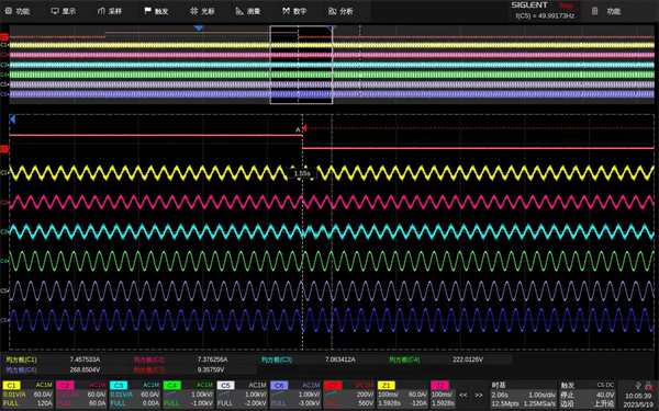 ·三相交流電分析,三相交流電廣泛應(yīng)用于需要高能效或大功率的機電設(shè)備,如三相逆變器、電機、驅(qū)動器等。逆變器廣泛應(yīng)用于家電、太陽能光伏發(fā)電、風(fēng)能發(fā)電等,而在諸多汽車系統(tǒng)中,主驅(qū)、水泵、油箱冷卻系統(tǒng)都是由三相電所控制,對這些設(shè)備進行功率分析和電能質(zhì)量測量必不可少。使用SDS6000 Pro分析三相電時,其中3路接高壓差分探頭測量電壓,3路接電流探頭測量電流,這樣不僅能直接觀測到實時波形,還能利用數(shù)學(xué)運算進行各種信號處理得到電流有效值、視在功率、波峰因數(shù)、諧波失真等參數(shù)。