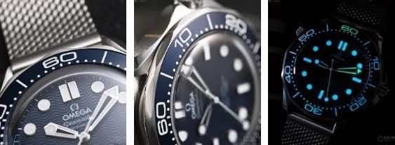 新款海馬系列300米潛水表詹姆斯·邦德60周年紀(jì)念版精鋼款,表殼尺寸為42毫米,表殼10點(diǎn)位是排氦閥,這些和常規(guī)海馬300米一樣。第一個需要注意的特點(diǎn)是,手表的表圈,是鋁圈。藍(lán)色的鋁圈,顏色偏暗。之所以不用陶瓷圈,而使用鋁圈,就是為了模仿早期海馬300米的樣式。表圈上的第二個特點(diǎn)是,表圈零位的數(shù)字刻度,是60,而不是常規(guī)海馬300米的“倒三角”。使用數(shù)字60,以突出“邦德60周年”紀(jì)念。同時(shí),鋁圈上的所有數(shù)字刻度,都有夜光。