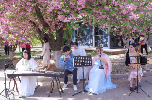 賞櫻線路上,櫻花大道內一群青年大學生身懷技藝,各式才藝展演,民樂、古箏獨奏、管弦、鋼琴獨奏、快閃《愛出發(fā)》《花?!贰肚啻壕毩晝浴贰恫坏貌粣邸贰逗髸o期》街舞、中國舞、樂隊青春活力,青年大學生校園科技文化展示區(qū)機器人展示、大賽作品及藏品展、模型沙盤互動、環(huán)保、創(chuàng)城互動區(qū)地球日主題、綠色農業(yè)創(chuàng)城理念、經(jīng)濟普法知識互動,展示了當代大學生的蓬勃的創(chuàng)新精神和社會責任感。