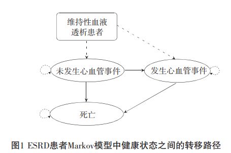 研究采用Markov模型法,將模型結(jié)構(gòu)分為未發(fā)生心血管事件(NCVD)、發(fā)生心血管事件(CVD)、死亡(death)三個(gè)獨(dú)立狀態(tài),模擬接受常規(guī)血液凈化以及聯(lián)合HA樹脂血液灌流的ESRD患者疾病進(jìn)程,計(jì)算接受不同治療方案患者的疾病成本與質(zhì)量調(diào)整壽命年(QALY)。模型循環(huán)周期為26周,研究時(shí)限為終生,評估不同治療方案患者的疾病成本與質(zhì)量調(diào)整壽命年。