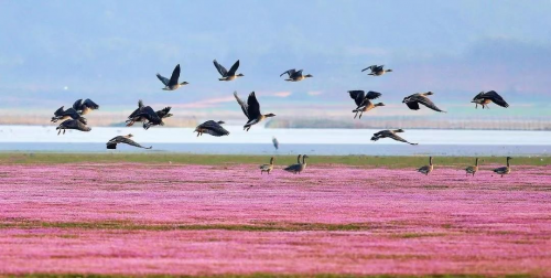 遠山晚霞鋪滿天際,一群飛鳥掠過夢幻花海,空氣中漂浮著沁人心脾的甜香……作為鄱陽湖地區(qū)候鳥遷徙的第一站,馬影湖美得仿佛仙境落到了人間。