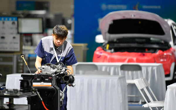 在天津舉行的首屆世界職業(yè)院校技能大賽上,參賽選手在進(jìn)行發(fā)動機(jī)拆卸維護(hù)展演。