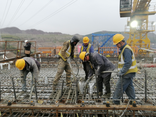 圖為沈白高鐵建設(shè)中的白山渾江特大橋,該橋是全線控制性工程,全橋長(zhǎng)1499.5米,全橋共有鉆孔樁588根,橋墩臺(tái)56個(gè),大跨度連續(xù)梁3個(gè),道岔連續(xù)梁1個(gè),正在澆筑混凝土的是道岔連續(xù)梁和10號(hào)墩0#塊。該橋先后跨越渾江、輝臨高速公路及G201國(guó)道,涉臨近鐵路既有線施工,安全風(fēng)險(xiǎn)高,施工難點(diǎn)多。