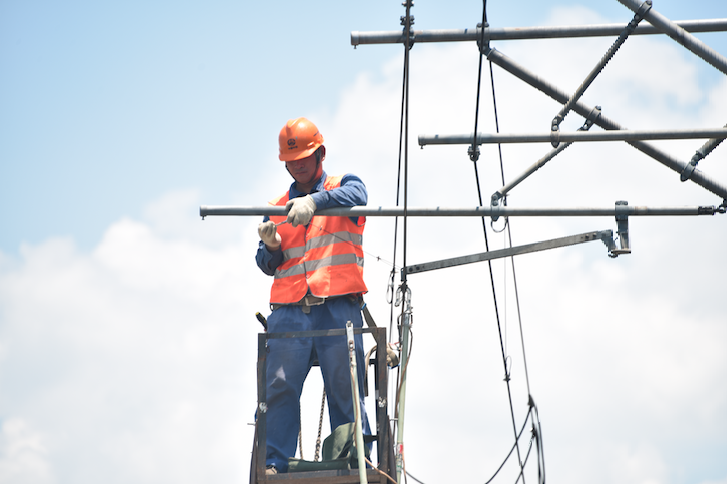 終于等到車梯豎起來,“扶好車梯!”剛囑咐好輔助人員,劉冉就帶著小李竄到了車梯上,現(xiàn)在的他只想早點(diǎn)干完活,早點(diǎn)休息??蓜傞_始干活沒一會(huì),劉冉看著腕臂上動(dòng)作又慢又變扭的小李就來了脾氣,“墨跡什么呢,身體貼在腕臂上干,搞快點(diǎn)!”“劉工,主要是這腕臂太燙了?!毙±詈芪慕忉尩馈2还饩€路上熱,此時(shí)支柱上的金屬設(shè)備因?yàn)闀窳艘簧衔?#xff0c;溫度已經(jīng)超過50℃,帶著手套還感覺不出來,但隔著一層薄衣服的話就燙的難受。“你站車梯框里干,我過去?!笨吹皆O(shè)備溫度都這么高,此時(shí)的劉冉更擔(dān)心大家的身體,可千萬別中暑了啊。