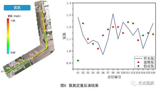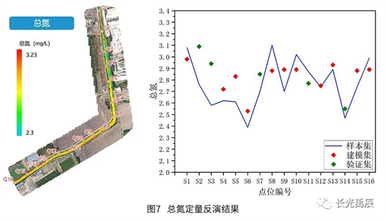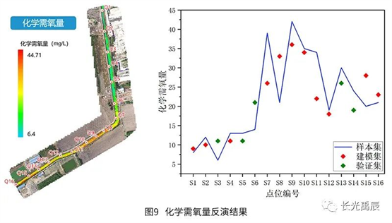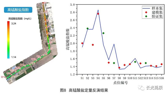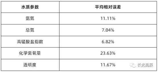 精度評(píng)定結(jié)果見表2.各水質(zhì)參數(shù)的平均相對(duì)誤差均在25%以下,可滿足常態(tài)化、高頻次的全局水質(zhì)檢測(cè)需求?;瘜W(xué)需氧量反演誤差稍大是因?yàn)樵摋l河道整體水質(zhì)情況存在較大的空間異質(zhì)性,河道不同河段中有機(jī)物含量差異較大,而水體化學(xué)需氧量與有機(jī)物濃度密切相關(guān),所以這種變化較快的梯度可能會(huì)引入一定的誤差,模型也有繼續(xù)優(yōu)化的空間。