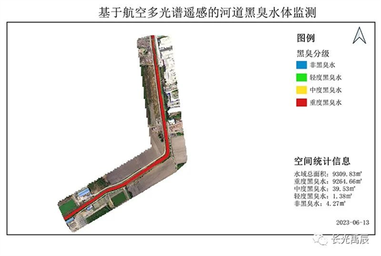 黑臭水體是指水質(zhì)污染嚴(yán)重、水體顏色異常、散發(fā)惡臭的情況。它通常由生活污水、工業(yè)廢水和農(nóng)業(yè)排放物等引起,造成環(huán)境破壞和健康風(fēng)險(xiǎn)。通過無人機(jī)多光譜遙感技術(shù),結(jié)合水色與實(shí)測(cè)水質(zhì)參數(shù)數(shù)據(jù)的分析,對(duì)本次實(shí)驗(yàn)河道黑臭水污染的識(shí)別情況如圖5所示。