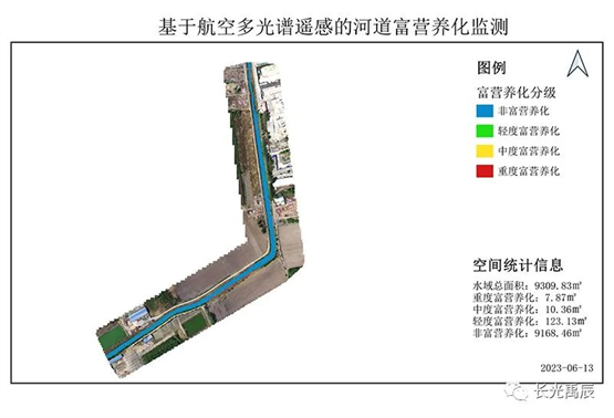 水體富營養(yǎng)化是指水中營養(yǎng)物質(zhì)(如氮、磷)過度積累,導(dǎo)致水體中藻類、水生植物大量繁殖的現(xiàn)象。水體富營養(yǎng)化會(huì)造成藻類過度生長(zhǎng),破壞水生態(tài)系統(tǒng)的平衡,甚至引發(fā)水體死亡。通過無人機(jī)多光譜遙感技術(shù),結(jié)合實(shí)測(cè)水質(zhì)參數(shù)數(shù)據(jù)的分析,對(duì)本次實(shí)驗(yàn)河道水體富營養(yǎng)化的識(shí)別情況如圖4所示。