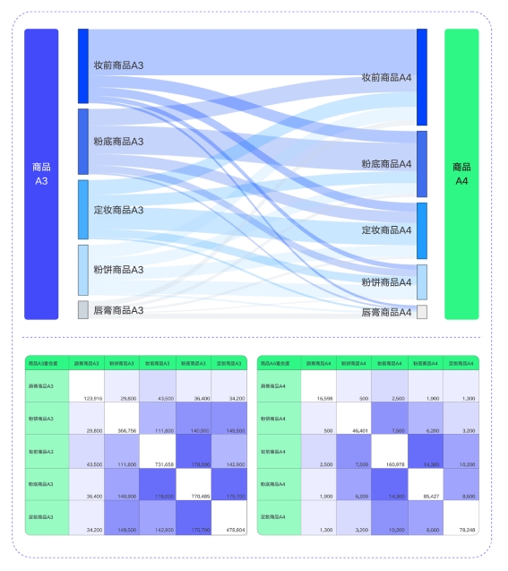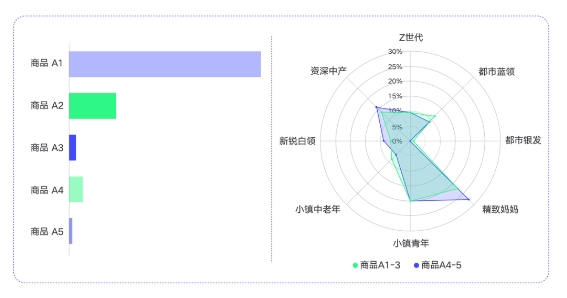 具體到5A維度,商品A1與A2聚焦用戶商品曝光行為,商品A3聚焦用戶的商品主動(dòng)行為,如商品點(diǎn)擊、收藏、加購等,商品A4、A5則更側(cè)重抖音域內(nèi)用戶的商品購買和復(fù)購行為,通過科學(xué)的分層,清晰呈現(xiàn)指定商品在抖音域內(nèi)的種草與轉(zhuǎn)化效率。