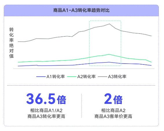 此外,商品5A從生意結(jié)果出發(fā),建立了人群商品行為和生意的關(guān)聯(lián)。其中,商品A3的樞紐價(jià)值尤其值得關(guān)注。相比商品A1/A2,商品A3的轉(zhuǎn)化率高出36.5倍;相比商品A2,商品A3的客單價(jià)高出2倍。這意味著在抖音生態(tài)內(nèi),商品A3人群對(duì)商品的喜愛程度更高,且更愿意購買該商品。品牌商家可以重點(diǎn)錨定商品A3人群進(jìn)行種草,放大營(yíng)銷效果,在市場(chǎng)競(jìng)爭(zhēng)中占據(jù)優(yōu)勢(shì)。