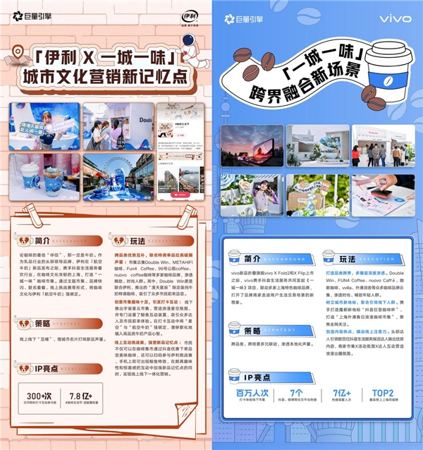 在垂類營銷層面,抖音生活服務(wù)打造《一城一味》IP,分別聯(lián)合vivo、伊利開展跨界營銷,借由上??Х任幕芗啊翱Х仁小钡某鞘形幕?通過線上種草、線下聚合客流打卡體驗的方式,將品牌新品融入用戶高頻生活場景,有力強化上海本地消費者對新品的認(rèn)知。