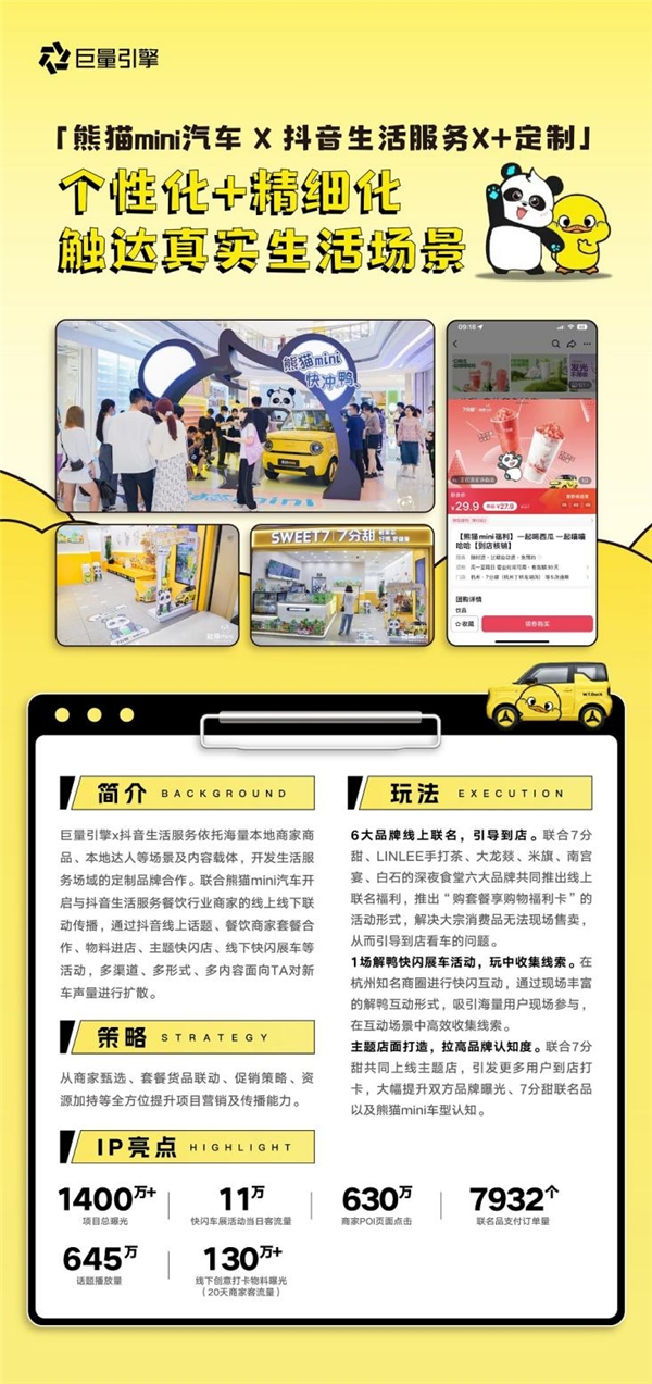 針對線索獲取成本高、轉(zhuǎn)化鏈路長等痛點,抖音生活服務(wù)聯(lián)手熊貓mini,攜手七分甜、LINLEE手打茶等六大品牌打造聯(lián)名福利,并在核銷等生活場景中植入新車,既擴散新車聲量,又高效收集高意向線索。
