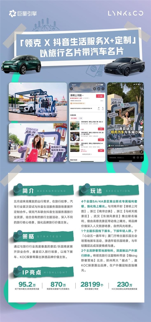 針對領(lǐng)克汽車亟需打響“旅游出行必選車”的需求,抖音生活服務(wù)酒旅商家首次與汽車客戶領(lǐng)克進行聯(lián)動,將領(lǐng)克汽車帶進全國景區(qū)、主題樂園、營地等旅行場景,推動“汽車+旅游”新融合,宣揚“領(lǐng)克汽車=旅行新選擇”品牌價值主張。