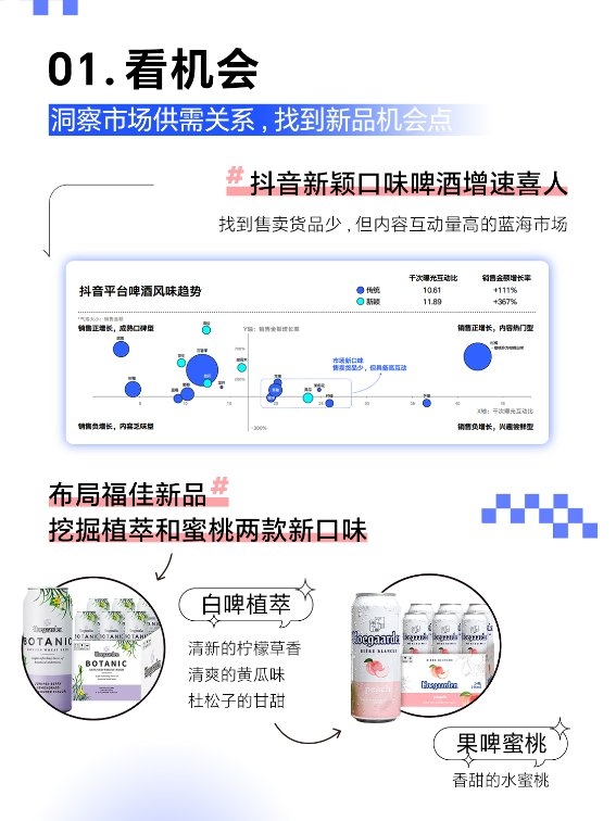 基于巨量云圖商品洞察能力,福佳對抖音啤酒大盤現(xiàn)狀及細分賽道趨勢進行分析,發(fā)現(xiàn)抖音啤酒細分類目均正增長,其中白啤增長最可觀,果啤趨向高客單商品。進一步洞察抖音啤酒風(fēng)味趨勢發(fā)現(xiàn),新穎口味啤酒增速喜人,黃瓜和桃子兩種口味受抖音消費者關(guān)注,但市場的針對性供給較少,蘊含巨大的發(fā)展?jié)摿?這恰巧與福佳現(xiàn)有產(chǎn)品組合高度匹配。