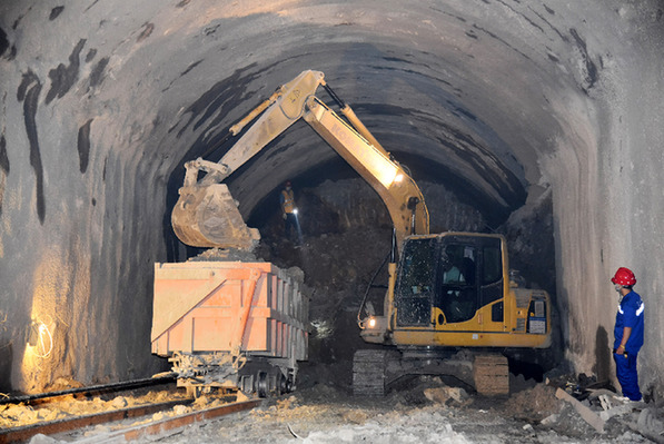 滇中引水工程建設全面提速。圖為5月30日,中國中鐵五局的建設者在滇中引水工程昆呈隧洞9號支洞內施工。新華社記者 林碧鋒 攝
