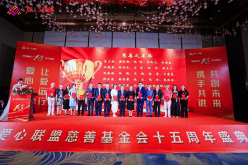 下午,愛(ài)心聯(lián)盟慈善基金會(huì)成立十五周年盛典隆重舉行。全國(guó)勞動(dòng)模范、全國(guó)五一勞動(dòng)獎(jiǎng)?wù)芦@得者、全國(guó)道德模范、吉林省工商聯(lián)副主席、吉林省河南商會(huì)會(huì)長(zhǎng)、愛(ài)心聯(lián)盟慈善基金會(huì)理事長(zhǎng)李萬(wàn)升,河南省政府駐上海辦副主任胡華杰,哈爾濱市政府駐上海辦經(jīng)協(xié)處處長(zhǎng)田磊,中國(guó)浦東干部學(xué)院黨建研究中心主任吳濤,上海中信國(guó)旅總經(jīng)理羅良剛,山東馳恒投資發(fā)展有限公司董事長(zhǎng)王久紅,昆山物流協(xié)會(huì)會(huì)長(zhǎng)孫喜,來(lái)伊份股份有限公司高級(jí)副總裁趙漢利,新希望集團(tuán)草根資本投資部部長(zhǎng)許云龍,上海歐邦醫(yī)療管理有限公司創(chuàng)始人崔海茹,眼界(上海)健康管理有限公司創(chuàng)始人謝攖寧,浙江省有機(jī)產(chǎn)業(yè)協(xié)會(huì)理事長(zhǎng)胡珊,上海妃魚股份高級(jí)副總裁李財(cái)鋒,愛(ài)心聯(lián)盟慈善基金會(huì)執(zhí)行理事長(zhǎng)楊崢,以及上海市工商聯(lián)直屬商會(huì)和各省市在滬異地商會(huì)秘書長(zhǎng)等來(lái)自全國(guó)各地的精英和愛(ài)心聯(lián)盟成員300余人歡聚一堂,共同慶祝愛(ài)心聯(lián)盟慈善基金會(huì)成立十五周年。