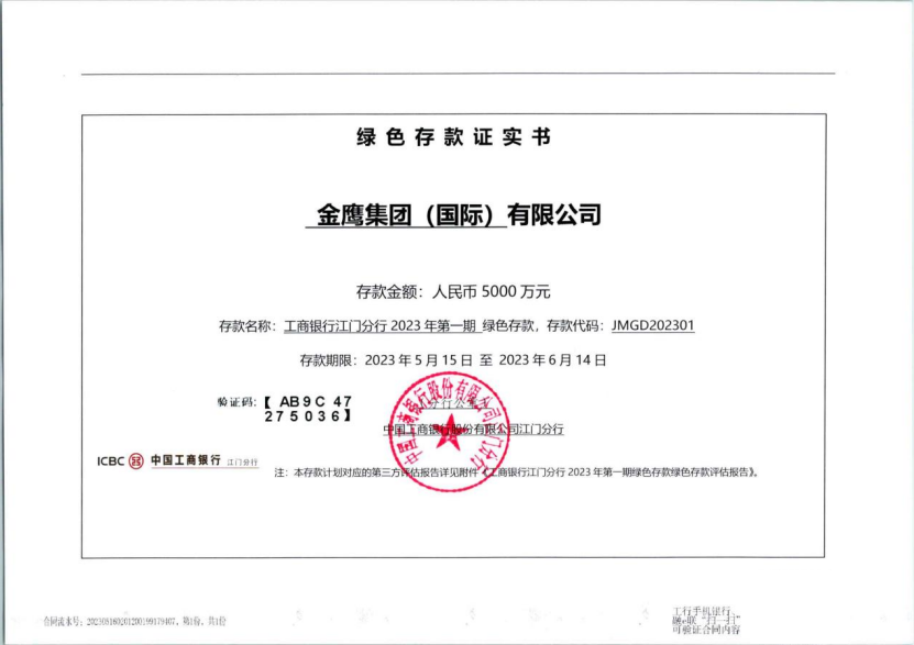 根據(jù)工商銀行江門分行的綠色存款產(chǎn)品計(jì)劃書,金鷹集團(tuán)的綠色存款將主要投放到污水處理類(污水處理及收集)項(xiàng)目、資源綜合利用類(生活垃圾焚燒發(fā)電)項(xiàng)目及其他符合規(guī)定條件的綠色產(chǎn)業(yè)項(xiàng)目。上述項(xiàng)目,均已通過獨(dú)立第三方專業(yè)認(rèn)證機(jī)構(gòu)——中誠信綠金科技(北京)有限公司鑒定。此外,工商銀行江門分行每半年定期向金鷹集團(tuán)提供《綠色存款評估報(bào)告》,通過詳細(xì)數(shù)據(jù)追蹤資金使用情況,確保綠色存款專用于綠色項(xiàng)目。