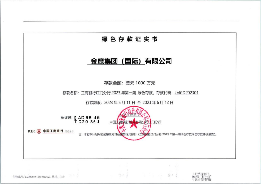 工商銀行江門分行相關(guān)負(fù)責(zé)人表示,與金鷹集團(tuán)開展的全國首筆NRA境外機(jī)構(gòu)綠色存款業(yè)務(wù)擴(kuò)大了綠色存款計(jì)劃的主體參與范圍和規(guī)模,為環(huán)境友好型企業(yè)引入了新的綠色金融活水,將加快綠色產(chǎn)業(yè)項(xiàng)目建設(shè)進(jìn)度,助力構(gòu)建綠色可持續(xù)發(fā)展格局。