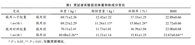 國家體育總局運動醫(yī)學研究所的一項針對男子足球運動員賽前準備期和比賽期血液生化指標和運動能力的研究表明,服用八子補腎膠囊受試者實驗后,脂肪重量和體脂率較實驗前明顯降低[3](見表1)。