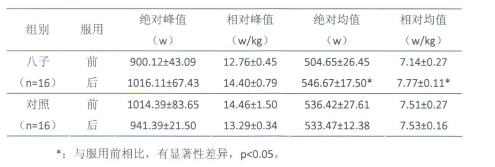 在減少脂肪含量的同時,還要注意增加肌肉量。這里要關注一個指標,無氧運動能力。無氧運動能力是人體基本運動能力之一,主要反映機體骨骼肌在不同運動階段短時快速激烈運動的一種運動能力。來自國家運動營養(yǎng)測試研究中心的一項實驗報告表明,服用“八子補腎膠囊”后運動員的無氧功率平均值和相對無氧功率平均值明顯升高,說明“八子補腎膠囊”可以提高無氧運動能力[6](見表2)。