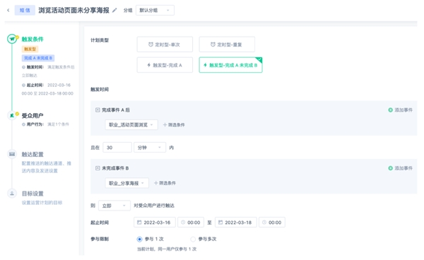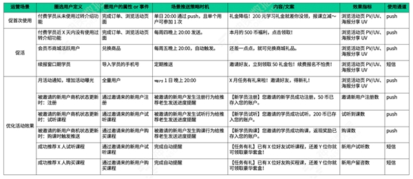我們梳理了三種運(yùn)營(yíng)場(chǎng)景,對(duì)于未參與過(guò)轉(zhuǎn)介紹活動(dòng)的用戶(hù)可以促其首次使用;對(duì)于之前參與過(guò)但近期未參與的用戶(hù)進(jìn)行促活;對(duì)于完成階段性目標(biāo)的老用戶(hù)進(jìn)行觸達(dá)提醒,來(lái)優(yōu)化活動(dòng)的效果,如下表所示: