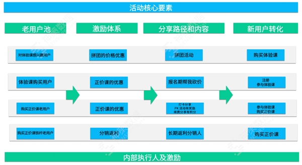 激勵(lì)體系:激勵(lì)體系是活動(dòng)“玩”起來(lái)的核心。確定激勵(lì)物是什么需要考慮和業(yè)務(wù)、目標(biāo)的貼合度,同時(shí)也需要考慮成本。比如素質(zhì)教育喜歡用課時(shí)來(lái)獎(jiǎng)勵(lì)購(gòu)買(mǎi)正價(jià)課的老用戶(hù),或是給予虛擬幣用來(lái)購(gòu)買(mǎi)周邊;職業(yè)教育喜歡拼團(tuán)給予低價(jià)體驗(yàn)課,為正價(jià)課的轉(zhuǎn)化埋伏筆。對(duì)于公司具體應(yīng)該給用戶(hù)什么激勵(lì)這件事兒,我們建議本著不重復(fù)造輪子的原則,先參考同行,再根據(jù)效果成本進(jìn)行迭代。