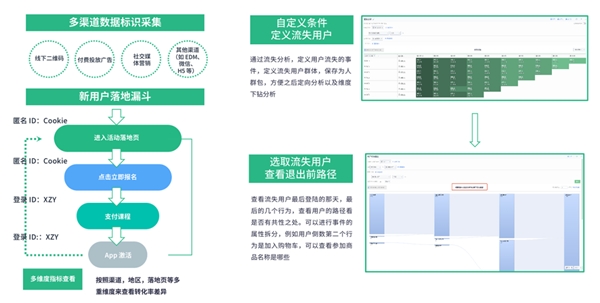 第二,接得住,即流量承接方式的優(yōu)化效率。投放物料效果的好壞,會直接影響轉化率和獲客成本,最合理的評估方式是通過 A/B 測試,快速迭代和優(yōu)化落地頁。另外,神策數(shù)據(jù)職業(yè)教育 & 素質教育解決方案能夠實現(xiàn)新用戶從站外到站內行為路徑貫通,有效定位線索流失原因,進而調整承接策略。
