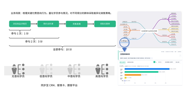 當學員與課程產品交互越多,用戶畫像就會越豐富,班主任對學員的復購、進階意向也就掌握得更精準,通過量化學員關鍵行為,及時跟進高意向學員,并對不同群體采取差異化銷售策略,以此提高學員復購率。