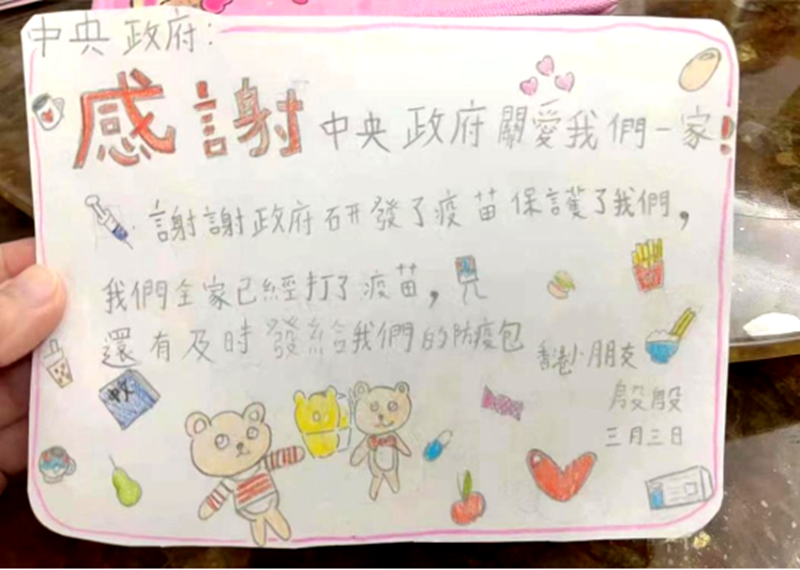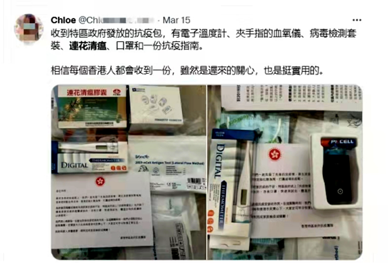 “收到特區(qū)政府發(fā)放的抗疫包,有電子溫度計、夾手指的血氧儀、病毒檢測套裝、連花清瘟膠囊、口罩和一份抗疫指南,挺實用的?!苯?#xff0c;一名居家隔離的香港居民收到政府派發(fā)的“抗疫物資包”后,在社交平臺開心的曬出圖文。更早前,一位叫殷殷的香港小朋友用自己手寫的感謝信,表達了對中央政府為香港市民提供防疫物資的感謝。隨著疫情防控的逐步深入,一個個像這樣滿載關(guān)愛的“抗疫包”越來越快地出現(xiàn)在人們手中。