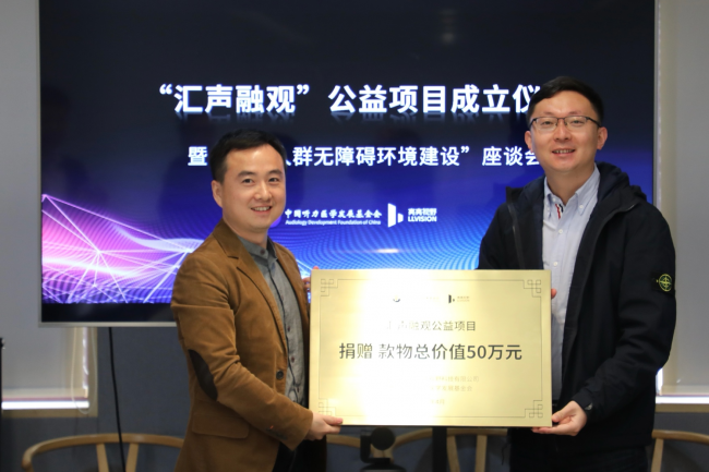 中國(guó)聽(tīng)力醫(yī)學(xué)發(fā)展基金會(huì)常務(wù)副理事長(zhǎng)兼秘書(shū)長(zhǎng)公澤忠(右)同北京亮亮視野科技有限公司首席運(yùn)營(yíng)官婁身強(qiáng)(左)共同完成公益項(xiàng)目的捐贈(zèng)儀式