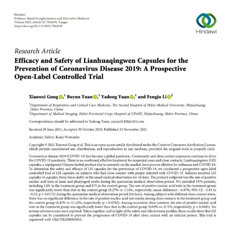 連花清瘟膠囊/顆粒預防新冠肺炎的作用得到了臨床研究的證實。前不久,由河北醫(yī)科大學第二醫(yī)院呼吸與危重癥醫(yī)學二科主任袁雅冬教授主持開展的“連花清瘟膠囊預防新型冠狀病毒肺炎”真實世界研究論文被國際權(quán)威期刊《循證補充和替代醫(yī)學》刊發(fā)。該論文指出,連花清瘟膠囊在有效治療流感、新冠肺炎COVID-19的同時,兼具預防新冠肺炎的作用,為新冠疑似病例和密切接觸者提供了新的治療方案。