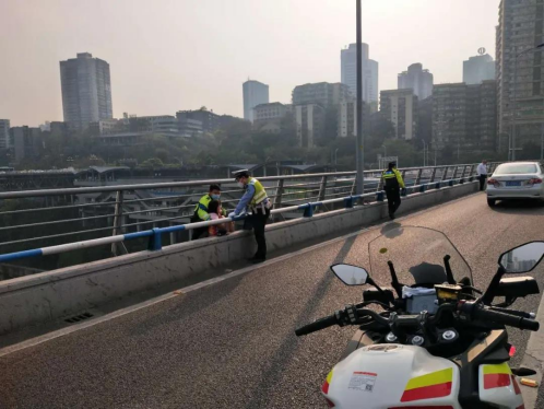 27歲的楊洋是上海英盾保安服務(wù)有限公司駐江北區(qū)公安分局交巡警支隊(duì)摩巡中隊(duì)(以下簡(jiǎn)稱(chēng)“渝警驍騎”)的一名隊(duì)員。2020年4月16日早上08時(shí)30分許,在渝澳大橋附近巡邏的楊洋突然接該支隊(duì)指揮室指令,稱(chēng)渝澳大橋中間往渝中區(qū)方向有女子輕生。此時(shí)正值上班高峰期,交通堵塞嚴(yán)重。接到指令后的楊洋立馬騎上巡邏摩托車(chē)前往事發(fā)地段,在其到達(dá)離事發(fā)現(xiàn)場(chǎng)約10米左右的距離時(shí),看到欲輕生女子已有一只腳跨出橋上欄桿,意欲再翻越欄桿跳下。此時(shí)有兩位民警正在耐心勸說(shuō),情況十分危急。
