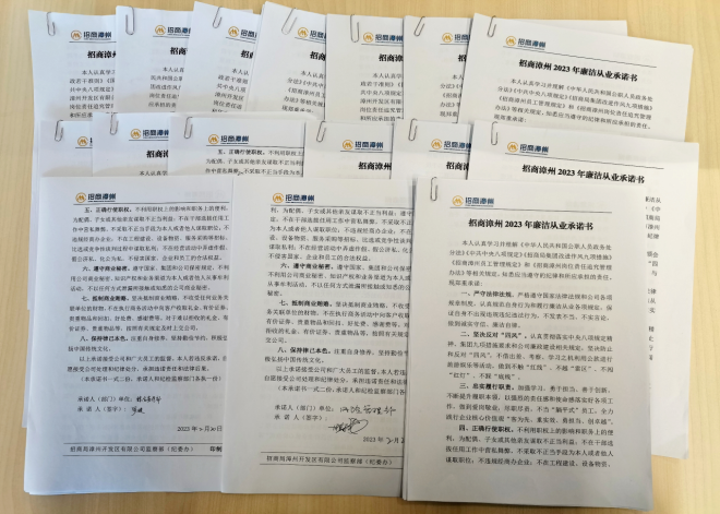 該公司紀委從發(fā)布簽訂《招商漳州2023年廉潔從業(yè)承諾書》后,黨委領(lǐng)導(dǎo)班子成員帶頭簽訂,11個部門和下屬企業(yè)黨支部,積極組織黨員干部員工認真學(xué)習(xí)承諾內(nèi)容,實現(xiàn)210位在崗干部員工人人參與、全員覆蓋,進一步強化自覺遵守廉潔從業(yè)規(guī)定的思想自覺和行動自覺。