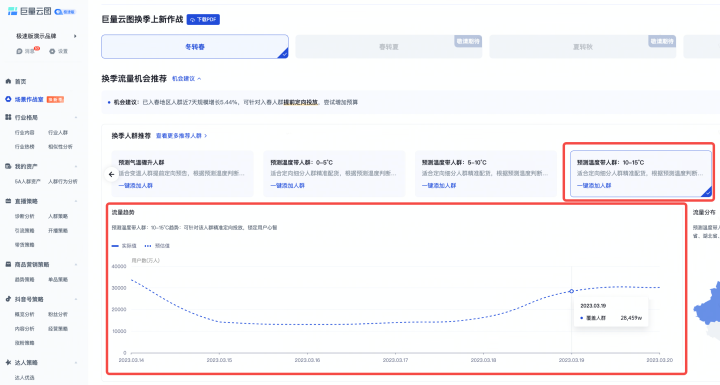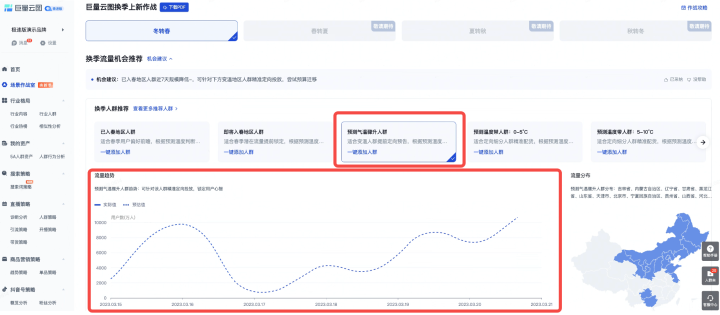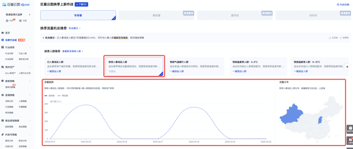 查看“已入春地區(qū)人群”或“即將入春地區(qū)人群”的流量趨勢,提前預(yù)知未來7天的入春人群規(guī)模,根據(jù)流量變化找到合適的換款時(shí)機(jī)。