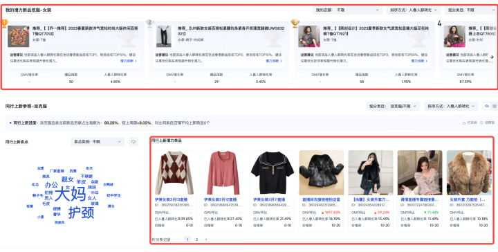 供應(yīng)鏈優(yōu)勢強(qiáng)、跟品速度快的商家,可以通過“同行上新參照”查看行業(yè)TOP10潛力單品,參考已入春人群轉(zhuǎn)化率、GMV環(huán)比增長率、價(jià)格帶等因素,綜合判斷確定選品策略;