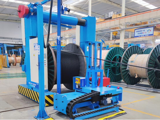 藍(lán)色自行小車把巨大的電纜軸送到既定位置,黃色的機(jī)械臂將線軸卡好,設(shè)備啟動后線纜開始自動纏繞,一盤整齊的電纜線慢慢成型。車間里,紅、黃、藍(lán)、白色的機(jī)械臂、自行小車等機(jī)械設(shè)備分工合作,有條不紊地生產(chǎn)。諾大的廠房中,零星行走著幾位身著藍(lán)色工裝、頭戴安全帽的工作人員。